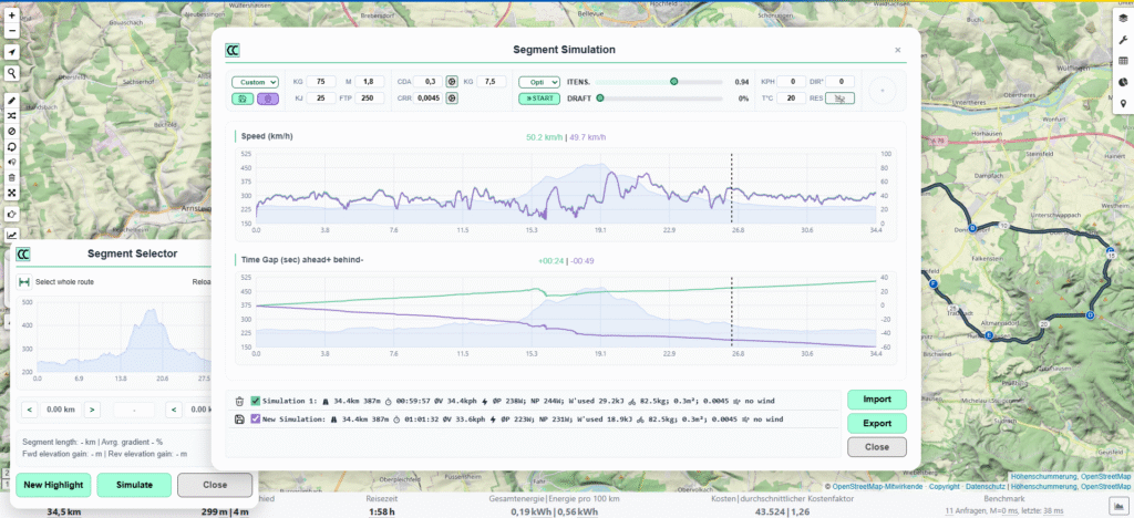 With version 1.1 I added a collection of features that analysze a route or a route segment and simulates riding it with different paces and strategies. Parameters like weight, air resistance coefficient, draft, or wind allow to adapt the model to a situation that you want to analyze and calculate. Use cases can range from a simple time estimation for a given route, to optimization of a time trial or a bike marathon. The simulation results can be exported as .gpx or .tpx which contain the route coordinates and also timestamps for all route points. This will allow you to compare your time to the simulated pacing on your bike computer while you are riding.