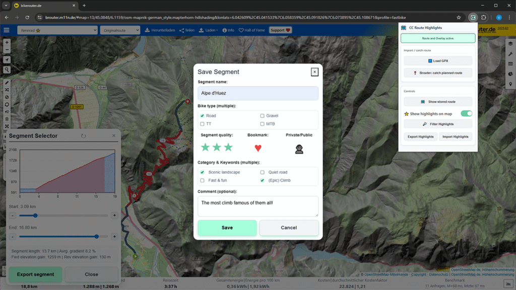 For these reasons, I started developing a small browser extension that allows users to mark, categorize, and save route segments as highlights. The tool works with the route planners Komoot (komoot.com), Bikerouter (bikerouter.de), and RideWithGPS (ridewithgps.com), and created highlights can be displayed on the maps of all supported planners, regardless of where or how they were created.